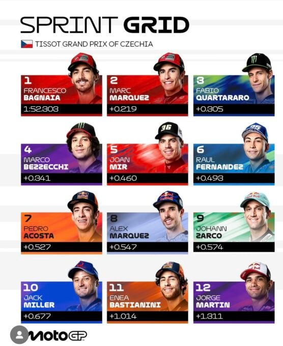 Déception en revanche pour Alex Márquez avec la Ducati du BK8 Gresini Racing, seulement huitième de cette Q2. Après s’être battu hier après-midi pour se qualifier directement, le deuxième du classement général provisoire n’était pas dans le rythme ce samedi matin et devra s’employer pour éviter de voir ‘Pecco Bagnaia réduire l’écart au Championnat du Monde.Partis à la faute dans leur dernier tour lancé, Johann Zarco et Jack Miller du Prima Pramac Yamaha sont respectivement neuvième et dixième.L’Australien est aux avant-postes depuis le début du week-end et a de quoi nourrir des regrets une fois de plus.Pour son retour à la compétition, le tenant du titre, Champion du monde 2024, l’Espagnol Jorge Martín d’Aprilia Racing, ne se qualifie qu’en douzième position juste derrière Enea Bastianini du Red Bull KTM Tech3.Fabio Di Giannantonio avec sa Ducati du Pertamina Enduro VR46 Racing Team pointe juste derriére tandis que Fermín Aldeguer avec l’autre Ducati du BK8 Gresini Racing, napparait qu’en dix-huitième position. Alfredo SORIAPhotos : MOTO GP – TEAMS