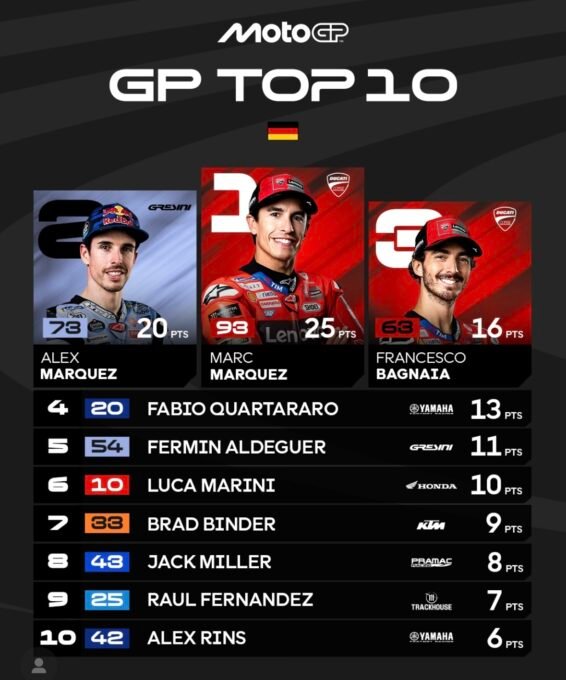 Le pilote de la Ducati Lenovo ‘Usine, la N°93 réalise une nouvelle démonstration ce dimanche 13 juillet 2025 et c’est encore lui l’ogre du MotoGP qui s’impose sur la piste du Sachsenring, lui vraiment LE ‘SACHSENKING triomphant devant son jeune frère Alex Márquez et son partenaire, l’autre pilote ‘ officiel Ducati, l’Italien Fransesco ‘Pecco Bagnaia, enfin à son plus haut niveau et qui retrouve le podium
