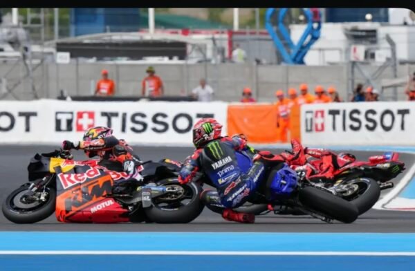 Très, très mauvaise journée coté pilotes tricolores car les deux pilotes Français sont tombés. Au départ Fabio Quartararo qui en tentant de s’infiltrer au 1er virage a touche Enéa Bastianini, incident qui lui vaudra ce dimanche un long lap de pénalité.Reconnu coupable d’avoir freiné trop tard et de heurter la KTM Tech 3, Fabio a expliqué: