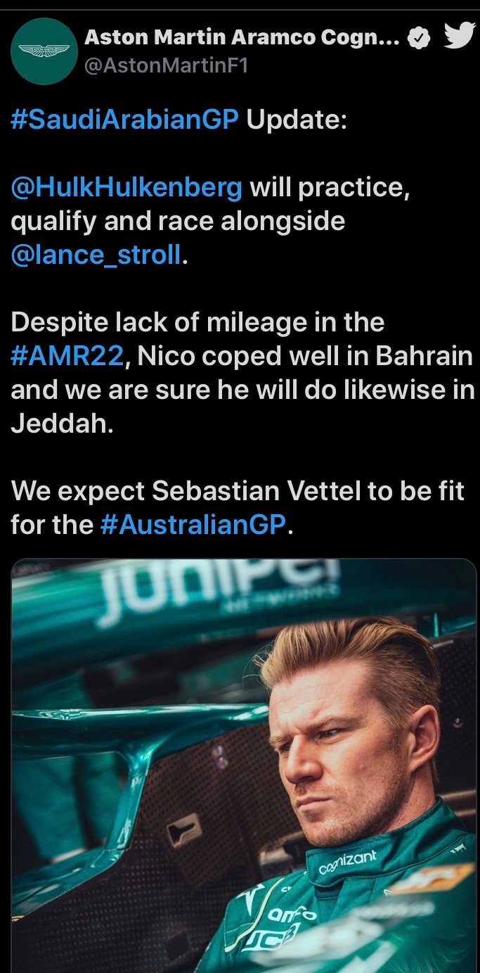 Comme le week-end dernier lors du Grand Prix d’ouverture de la saison 2022 sur le circuit de Sakhir situé dans l’Île de Bahreïn, le pilote Allemand Nico Hülkenberg, remplacera à nouveau pour le GP d’Arabie Saoudite à Djeddah, son compatriote, l’ancien quadruple Champion du monde Sebastian Vettel, testé positif au Covid-19, au volant de l’Aston Martin, aux côtés du jeune Canadien Lance Stroll.Vettel avait contracté le virus la semaine dernière à la veille du premier Grand Prix de Formule 1 2022, et pour cette raison il n’était pas encore parti pour Djeddah, après avoir regagné son domicile. en Suisse.L’équipe Aston Martin a attendu aussi longtemps que possible une décision finale, gardant Nico Hulkenberg en état d’alerte pour un autre appel. Maintenant l’annonce est officielle, à quelques heures de la première séance des essais libres du second week-end du calendrier 2022 en F1.