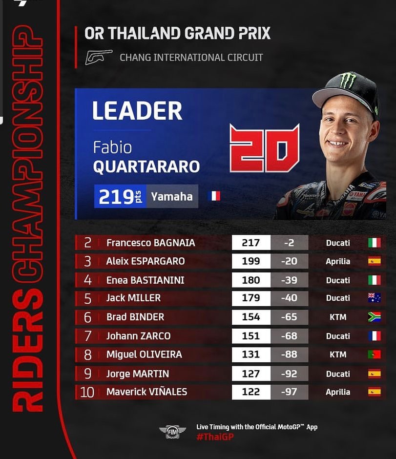 Fabio Quartararo devait se contenter d’une bien’ modeste dix septième position!Résultat, ‘El Diablo’ ne possède plus que deux longueurs d’avance sur Francesco ´Pecco Bagnaia au lieu des 18 en arrivant en Thaïlande !Il confiait :Quel cauchemar… Malheureusement, nous avons eu une course terrible et nous n’avons pas pu marquer un point. Après un très bon week-end en état sec il pleut juste avant notre course. Nous avions l’habitude d’être rapides cette année, mais nous avons eu des difficultés, des problèmes et des sentiments terribles. Je tiens à remercier les fans thaïlandais et à l’année prochaine. Il est temps de se remettre à zéro, de s’entraîner et de préparer Philipp Island