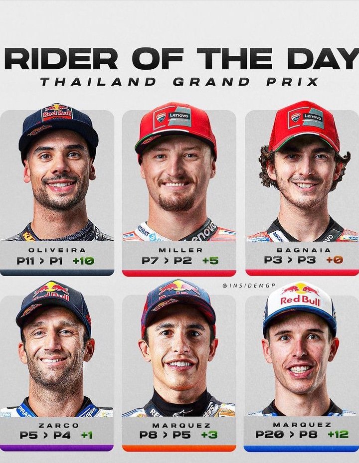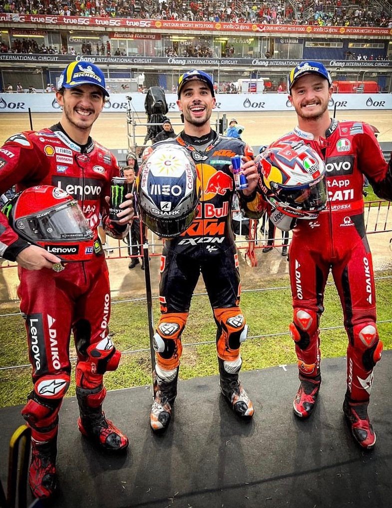 Puis au quatorzieme passage, Miguel Oliveira venait déloger Jack Miller du leadership, tandis que Francesco ´Pecco Bagnaia se retrouvait aux prises de Marc Márquez.Le Turinois allait néanmoins pouvoir compter sur le soutien de Johann Zarco dans les derniers tours, puisque le Français, revenu tel un boulet de canon, et qui alignait les tours les plus rapides, parvenait à s’intercaler entre le natif de Cervera et lui.Le représentant du team Ducati Pramac ne tentera ensuite aucune manœuvre, qui aurait pu mettre le n°63 en danger.Après l’arrivée le pilote Français expliquait : « J’ai été incisif sur Marc Marquez, moins sur Pecco Bagnaia. La piste a commencé à sécher sur les quatre derniers tours et c’était trop tard pour penser à la victoire. Encore que, si j’avais pu passer Pecco plus tôt, j’aurais pu tenter d’aller chercher Oliveira. Mais il n’y avait qu’une ligne et dès qu’on s’écartait, la moto glissait. Deux tours sont passés, et à deux tours de la fin, la victoire était impossible. Donc, c’était bien de la jouer intelligemment. Je visais la victoire, je suis à l’aise dans ces conditions, mais j’espérais que ça sèche un peu plus tôt. Je suis quand même content, c’est une belle course et un bon résultatEt puis il ajoutait et précisait encore :J’ai laissé le podium à Pecco. Depuis Misano, on a reçu des consignes de course. C’est difficile à appliquer quand on n’est pas en bagarre avec lui, mais aujourd’hui, c’était le cas. Quand une victoire est en jeu, Ducati ne bloque rien, mais pour une place d’honneur on donne la priorité à Pecco. »Mandalika – Buriram : bis repetita