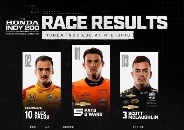 Alors que l’Espagnol Álex Palou avait survolé la majorité de la course après s’être élancé depuis la pole-position, c’est finalement le Mexicain Pato O’Ward qui à devancé le pilote du Chip Ganassi Racing pour s’imposer et remporter la course de Mid-Ohio à Lexington, toute première course de l’histoire de l’hybride en Championnat des monoplaces US de l’Indycar Séries.Et donc victoire pour le moteur Chevy de Chevrolet qui remporte la première course de l’histoire de l’ère hybride en Indycar Séries, avec Pato O’Ward qui est parvenu à résister à Álex Palou dans les derniers tours de cette épreuve de Mid-Ohio.Le Mexicain du coup décroche sa seconde victoire de la saison après celle qu’il avait obtenue sur tapis vert à la suite de la disqualification de Josef Newgarden à l’issue de la manche d’ouverture de la saison en Floride à rues de St. Petersburg.Auparavant sa dernière victoire précédente victoire précédente remontait à celle de l’Iowa en 2022.
