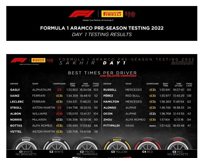 Le Français Pierre Gasly a été le plus rapide sur l’ensemble de cette 1ére des trois journées de la seconde et ultime session des essais collectifs d’avant-saison qui débutaient ce jeudi 10 mars 2022 sur la piste du circuit de Sakhir dans l’Ile de BahreïnAu volant de son AlphaTauri-Honda, l’ancien vainqueur du GP d’Italie 2020 à Monza, réalise le temps de référence avec un chrono de 1’33.902, lors de cette première journée des derniers essais officiels de pré-saison de Bahreïn, devant le duo des pilotes Ferrari, Carlos Sainz Jr, précédant avec 1’34.359 à 0.457, Charles Leclerc, crédité lui de 1’ 34.531, à 0.629.