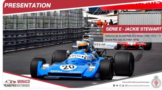 La série E reçoit les F1 de 1966 à 1972 de 3 litres, en mettant à l’honneur Sir Jackie STEWART qui détient 3 titres de Champion du Monde F1 (1969-1971-1973). L’écossais également remarquable tireur au pigeon d’argile sélectionné au JO. de 1960 à Rome est resté fidèle à Monaco et résident Suisse à Begnins a côté de chez Gilles GAIGNAULT, il ne rate jamais une occasion de retrouver chaque année la Principauté. Il y remporta 3 fois le Grand Prix en 1966, 1971 et 1973, sur BRM et TYRELL.14 voitures, avec des Ferrari 312, Mac Laren M14 et M19, Surtees TS 9B, Matra MS 120 S, Brabham BT 37, Cooper T 79 et March 721 G