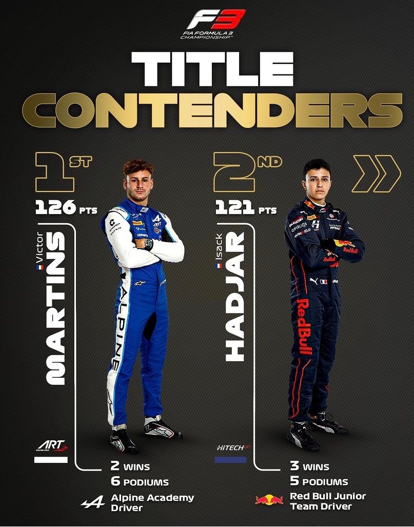 Dans cette session des chronos, Arthur Leclerc du Prema, cinquième avec 1’37″945 et sixième du championnat avec 101 points, et son coéquipier Oliver Bearman, sixième en 1’37″960, et quatrième du classement général avec 105 points, sont là.Bonne performance de William Alatalo, septième avec la Dallara de l’équipe Jenzer qui a précédé Jak Crawford, le dernier des sept prétendants au titre.Caio Collet, le Brésilien, si brillant lors des qualifications courses précédentes n’est que douzième devant Franco Colapinto, lui aussi en demi-teinte. François LEROUXPhotos : F3 -TEAMS