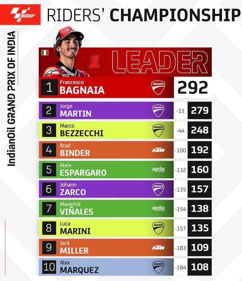 Quant au Champion du monde en titre et leader 2023, l’Italien Fransesco ´Pecco Bagnaia, l’officiel Ducati Lenovo, il a une fois de plus faute et chuté et ce alors qu’il occupait la seconde place…