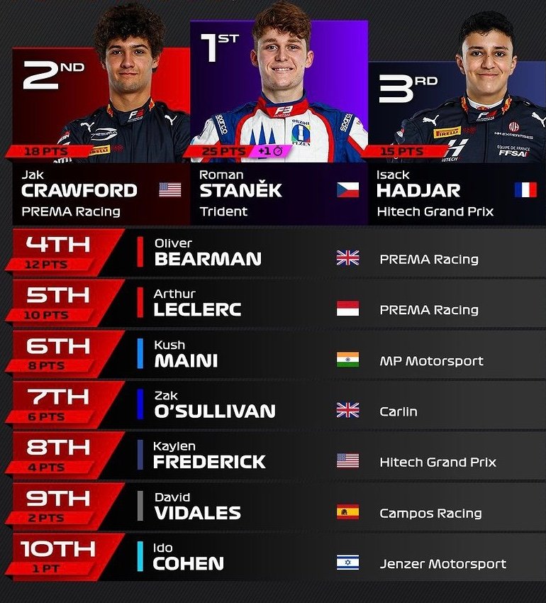 ISACK HADJAR[/caption] Le Français Hadjar de la filiére Red Bull très content, parti cinq termine troisième. Fantastique remontée de Leclerc, cinquième à l’arrivée.Le Championnat 2022 est visiblement très ouvert…Martins, seulement onze et donc hors des points dans cette seconde course, mène le classement ex aequo avec Leclerc avec 34 points, Mais dans la foulée avec 33, se trouve Stanek, avec 32 Crawford, et avec 31 Hadjar premier des rookies.Sur quatre courses disputées entre Sakhir et Imola, quatre vainqueurs différents pour quatre équipes différentes : Hadjar (Hitech), Martins (ART GP), Colapinto (VAR) et Stanek (Trident). Comme on peut le constater le jeu est très ouvert… John ROWBERG Photos : F3 – TEAMS