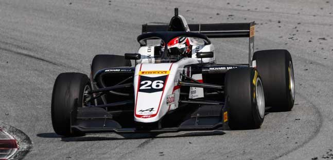 BELLE BAGARRE TOUTE CETTE COURSE[/caption] La voiture de sécurité entrera en piste après l’accident entre Nicola Marinangeli d’Arden Motorsport et Tommy Smith du JD Motorsport, et au redémarrage Minì, deuxième à ce moment-là, perdra deux position, s’inclinant contre Maloney et David.Une belle course également pour le vainqueur de la 1ére Course, le Russe Michael Belov du G4 Racing, qui remonte de six positions passant de la 11éme à la 5éme finale.Derrière lui Franco Colapinto du MP Motorsport, en hausse de cinq positions par rapport à, sa place sur la grille, un fantastique Dexter Patterson du Monolite Racing, septième et deuxième des ‘Rookies dés sa deuxième course de la série et venant directement de la F4.Paul Aron du Prema Powerteam, finit huitième, tandis que l’autre Français de R-ace GP, Isack Hadjar se classe neuvième, en hausse lui de sept positions, après des qualifications loupées, s’étant élancé de la seizième position, tout comme William Alatalo d’Arden Motorsport, dixième et positionné dix-sept sur la grille.Saucy qui indiquait après cette nouvelle victoire – sa septième – qui lui permet de caracoler en tête du classement provisoire, avec un total de 189 points contre 129, à son plus proche rival, le Français Hadrien David et de filer vers le titre:« C’est vraiment agréable de courir ici et la bataille avec Gabriele d’abord et Maloney après, a été formidable. J’ai apprécié chaque instant et cette victoire est aussi excellente pour le championnat. »Il poursuivait :« Au départ de cette piste, il ne faut pas seulement regarder devant mais aussi derrière car la ligne droite permet à votre rival d’utiliser le sillage et de vous attaquer. En Course 1, je suis parti très loin derrière pour une erreur dans la stratégie que nous avons utilisée pour les qualifications, mais finalement aussi dans cette course, j’ai réussi à limiter les dégâts » [caption id="attachment_366648" align="aligncenter" width="771"]