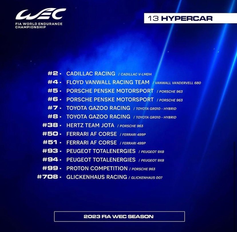 Jamais encore depuis la création et le lancement du Championnat du monde d’endurance WEC de la FIA en 2012, le plateau réuni, n’avait été aussi prestigieux en qualité et en quantité !Ce mercredi matin 11 janvier 2023, conjointement la FIA (Fédération Internationale de l’Automobile) et l’ACO (Automobile Club de l’Ouest) ont dévoilé la liste des engagés cette saison en Mondial WEC, laquelle compte 38 voitures, dont … 13 Hypercars.Assurément un record pour la catégorie reine de l’endurance.L’équipe Championne du monde en titre, celle des Japonais du Toyota Gazoo Racing, affrontera donc enfin une concurrence de très grande qualité, après de trop nombreuses saisons, sans aucun opposition et ce depuis les retraits successifs d’Audi d’abord, puis de Porsche ensuite.Et composé des Peugeot, des Porsche du Penske Motorsport, du Hertz Team JOTA et du Proton Competition, des Ferrari et ce sans oublier la Cadillac, la Glickenhaus et la Vanwall.Précisons qu’à ce jour, la toute nouvelle Isotta Fraschini ne figure pas curieusement dans la liste publiée.Pour ce qui concerne la catégorie LMP2, la qualité des écuries est également du Top niveau, mais hélas à nouveau composé d’un monopole ORECA, avec onze châssis sur onze inscrits!Et parmi elles, on note le retour de l’équipe Alpine Elf Team, qui affrontera le United Autosports et le Prema Racing avec deux voitures. Dont l’une au Prema, avec la jeune pilote Française Doriane Pin, qui après le GT, va découvrir la catégorie LMP2.A signaler également la présence de Vector Sport et d’Inter Europol Competition. Après une saison sensationnelle en 2022, les Iron Dames seront bien présentes en LMGTE Am.Le retrait des LMGTE Pro, laisse donc la place aux LMGTE Am, qui de ce fait a un record d’engagés dans cette catégorie avec 14 voitures.Quatre marques s’affronteront : Aston Martin, Corvette, Ferrari et Porsche.Après deux saisons en LMP2, le Richard Mille Racing s’associe avec la Scuderia AF Corse en 2023 pour créer une nouvelle équipe LMGTE Am.