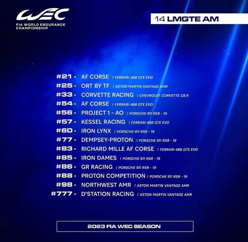 TF Sport est rebaptisé ORT by TF pour 2023 avec Ahamd Al Harty comme chef de file. Les Iron Dames, Sarah Bovy, Michelle Gatting et Rahel Frey, seront de retour, non plus au volant d’une Ferrari mais bien d’une Porsche et comme d’habitude toute de rose vêtue!Directeur général des ‘Le Mans Endurance Management, Frédéric Lequien, confie :« Il est réellement extraordinaire de voir le WEC et le sport automobile dans le monde entier devenir de plus en plus forts »Et il indique encore : « J’aimerais saisir l’occasion de souhaiter ici très chaleureusement la bienvenue à nos amis de Cadillac, Ferrari, Porsche et Vanwall qui rejoignent notre catégorie Hypercar cette année car c’est un grand honneur de voir tant de constructeurs s’associer au WEC et faire confiance à notre championnat. Il est également très encourageant de voir autant d’engagés en LMP2 ainsi qu’un nombre record d’équipes en LMGTE Am. Le WEC se prépare à vivre sa plus belle saison. »Pour sa part, » Pierre Fillon, le Président de l’Automobile Club de l’Ouest, précise :« Le championnat du monde d’Endurance de la FIA s’apprête à vivre l’une des plus palpitantes saisons de son histoire, . « La grille, composée notamment de 13 Hypercars de sept constructeurs différents, est annonciatrice de grandes batailles en piste tout au long des sept manches du championnat. Cette année, marquée par le Centenaire des 24 Heures du Mans, est attendue par tous les fans de sport automobile. Rendez-vous le 11 mars prochain à Sebring pour le Prologue de cette fantastique saison ! » Gilles GAIGNAULTPhotos : ACO