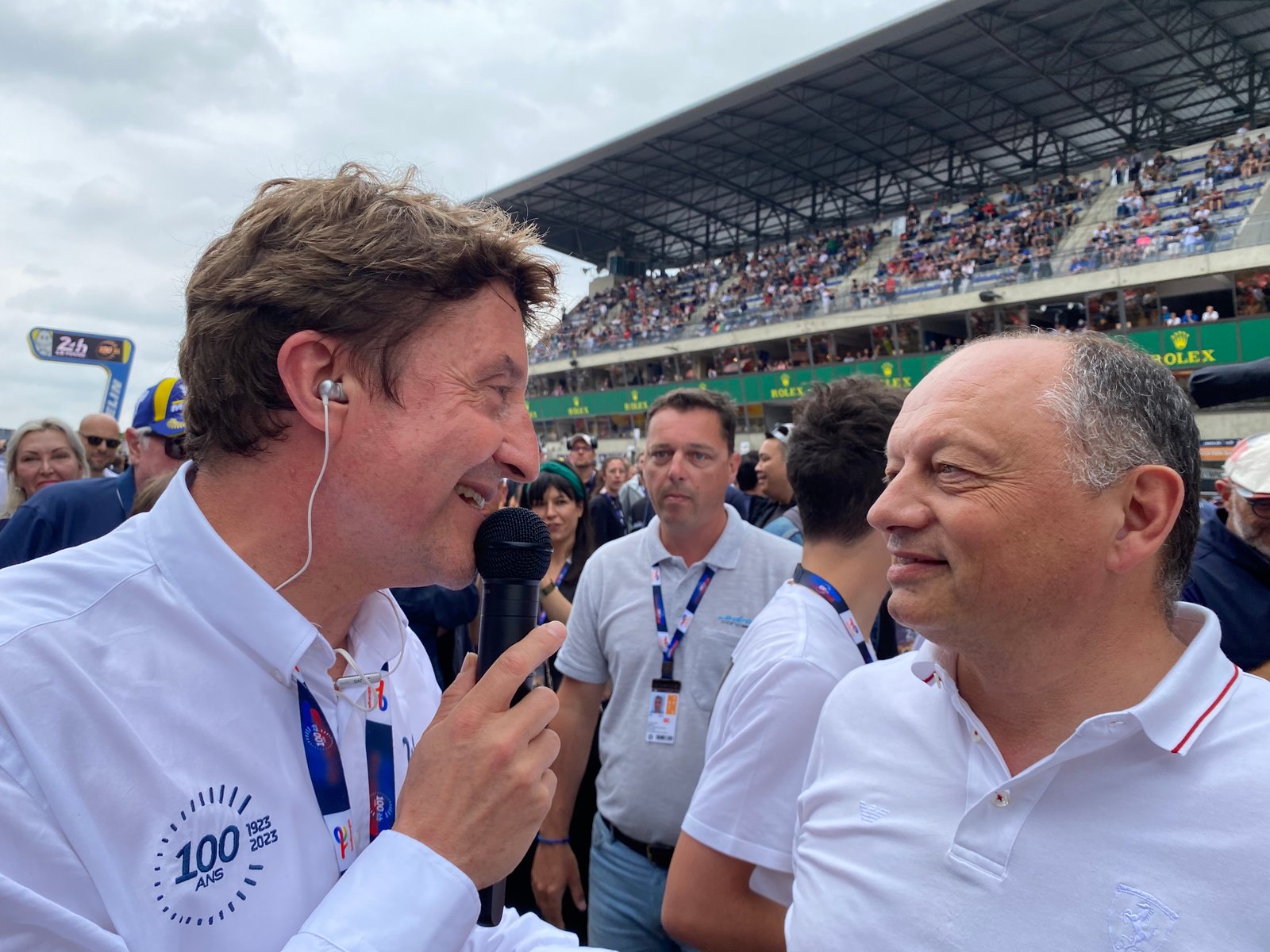 Du jamais vu en Sarthe depuis plusieurs décennies… Si ces dernières années il y avait une affluence considérable pour assister a la plus grande course du monde, les très célèbres 24 Heures du Mans, cette année pour fêter le Centenaire de la prestigieuse épreuve mancelle, la grande foule s’est déplacéeDepuis le pesage au coeur du Mans, il y a dix jours puis les essais préliminaires dimanche dernier, un vent de folie souffle sans discontinuer jour apres jour sur le circuit Manceau!300.000 agglutinés dans les tribunes archi bondées…Et ce samedi 10 juin 2023, sur la grille de départ il y avait une sacrée ressemblance avec le gala d’ouverture du tres select Festival de Cannes.Se mêlaient au milieu d’une foule d’invités des partenaires dt et des sponsors, et des VIP, bon nombre de visages connus… a commencer par la ministre des Sports, Amelie Oudea-Castera.