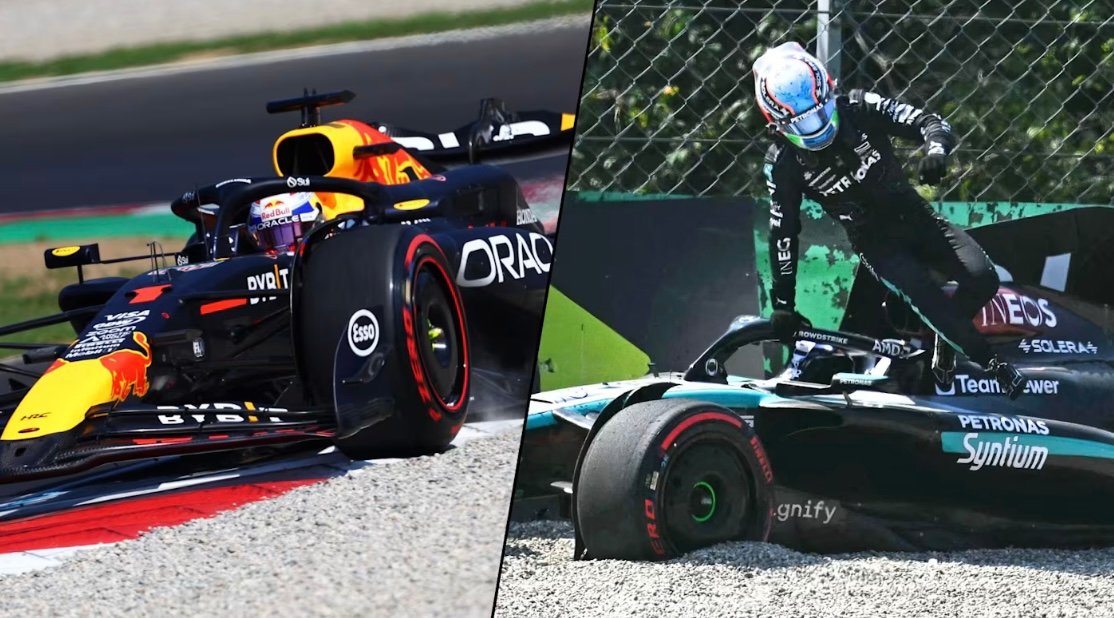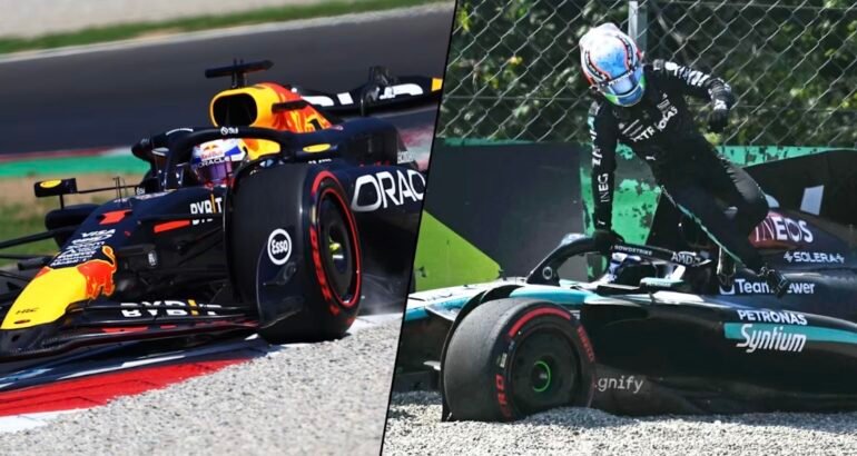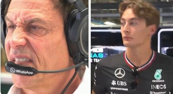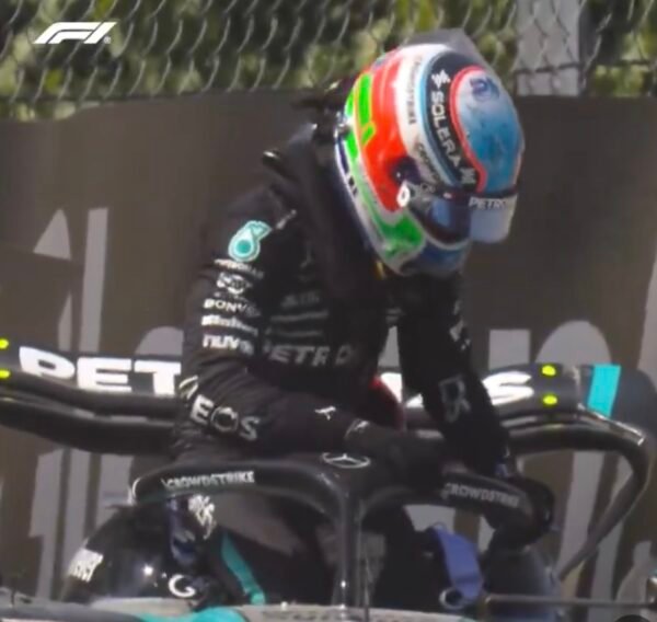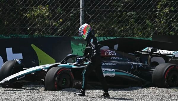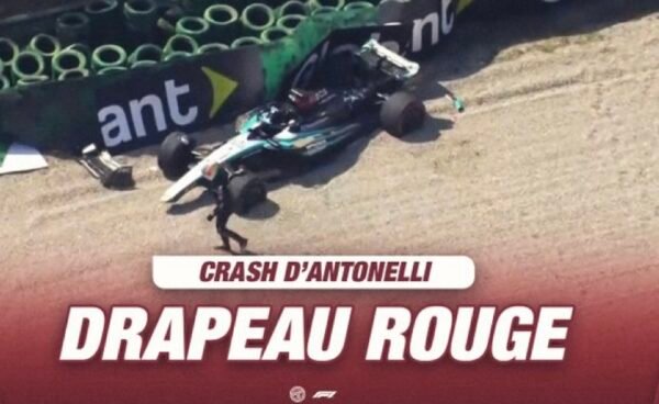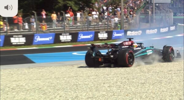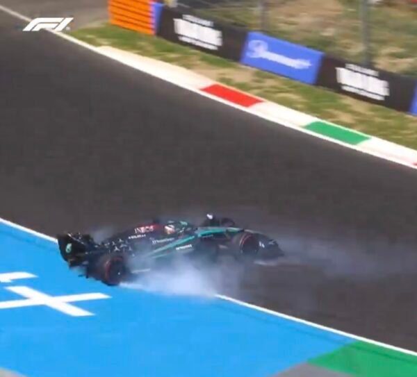 Naturellement le pilote attitré de cette Mercedes bien endommagé, l’anglais George Russell était cependant inquiet et vraiment soudainement devenu plus que soucieux lorsque dans le stand Mercedes, les yeux rivés sur les moniteurs des écrans TV, George a tout à coup aperçu sa monoplace, aux mains d’Antonelli, quitter la piste et ce pour la découvrir lourdement endommagée après ce crash dans la Parabolica.