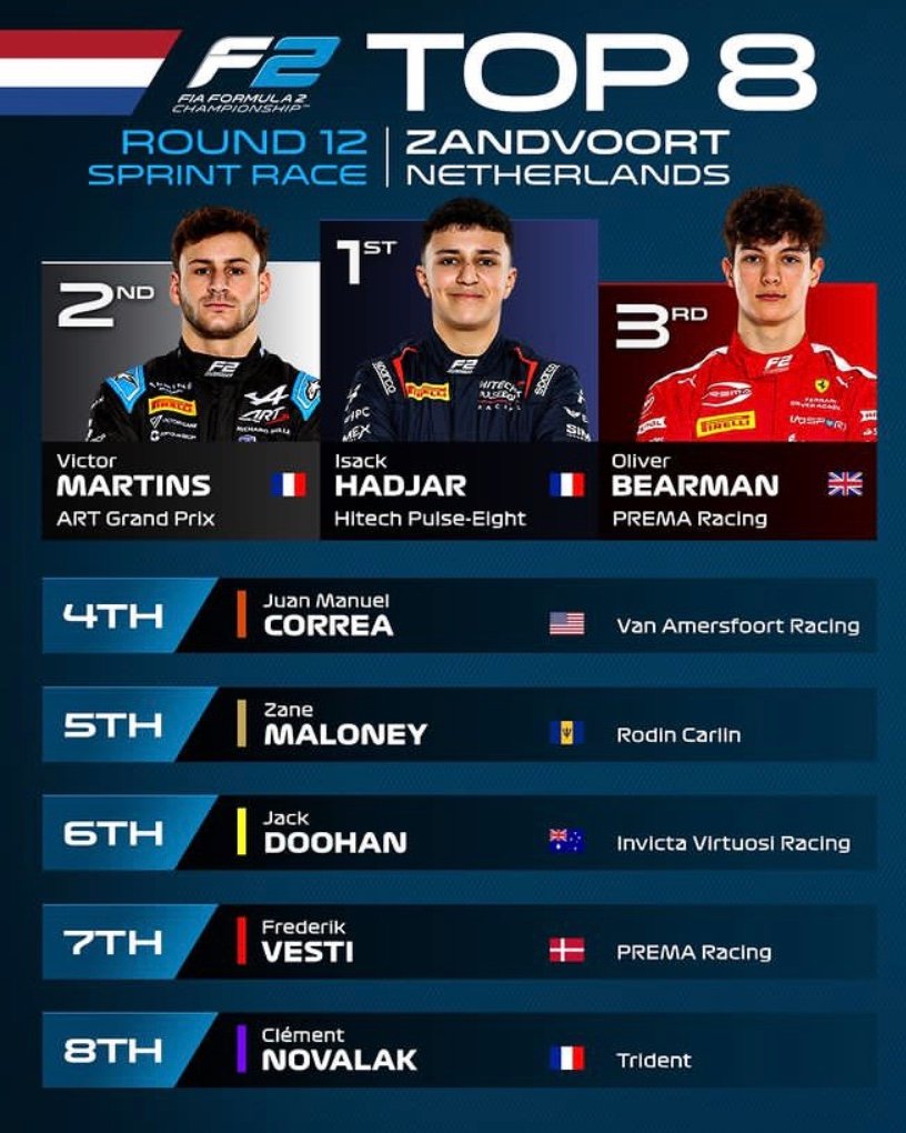 La course a donc vu la victoire du jeune Français qui s’élançait depuis la pole et ce en raison de la grille inversée, Isack Hadjar, devant son compatriote Victor Martins et Oliver Bearman, lequel était parvenu à dépasser Juan Manuel Correa au départ.Le leader du Championnat Théo Pourchaire qui partait plus tôt de la pole position, dès le tour de sortie de la voie des stands pour rejoindre la grille de départ, s’est retrouvé dans les rails… Parti bon dernier, le Français peut en partie se réjouir, étant donné qu’aucun point valable pour le classement du championnat ne sera attribué! John ROWBERGPhotos ; F2 – TEAMS LE RESULTAT DE LA COURSE ‘SPRINT