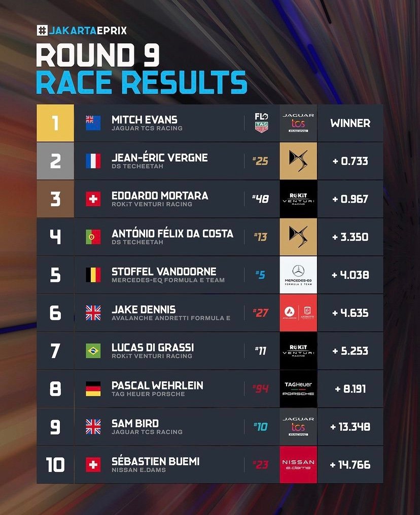 Waouh que le dernier tours et les ultimes mètres avec la dernière ligne droite ont du paraître long, terriblement longs aux leaders… En effet, ils devaient surveiller et jeter un œil inquiet sur leur tableau de bord respectif, car étaient tous à … 0% d’énergie encore disponible au passage sous le damier !Chaleurs et grosses transpirations garanties surtout dans la suffocante Indonésie …Et c’est finalement dans un mouchoir de poche que s’est joué la victoire, les trois premiers roulant de concert, regroupés à la queue leu leu!Le Néo-zélandais de l’équipe Jaguar, Mitch Evans, l’emportant in extremis, en précédant dans l’ordre, le Français Jean-Eric Vergne de DS Techeetah et le Suisse Edoardo Mortara, de Venturi, qui les accompagne sur le podium.Evans décroche du coup sa troisième victoire de la saison, après son double succès obtenu tout récemment à Rome, au mois d’avril.C’était dur je suis juste content d’avoir tenu jusqu’à la fin. Nous avons eu une dernière course difficile, et cette piste est similaire avec un climat d’un autre niveau. Nous avons beaucoup travaillé sur la configuration et les systèmes, mais l’équipe m’a donné ce dont j’avais besoin, m’a donné les moyens de gagner et tout c’est ce dont j’avais besoin. C’était vraiment serré à la fin avec JEV, je pensais que j’allais m’échapper mais mes pneus ont commencé à se dégrader dès que je l’ai dépassé. J’avais un peu chaud mais nous avons fait le travail. Nous en avions besoin. Nous avions besoin d’un bon résultat aujourd’hui. Mais évidemment, c’était une nouvelle piste, un nouveau climat, tout était nouveau – vous ne savez pas vraiment comment ça va se passer. Je suis donc très content du résultat, nous sommes de retour même si nous n’avons jamais vraiment été loin, mais ça nous remet en position de force, donc je vais en profiter.