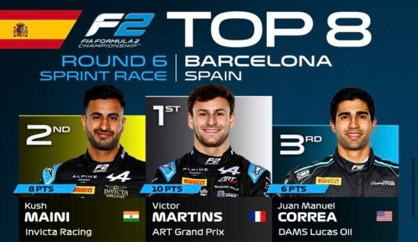 Kush MAINI et Juan Manuel COREA, sur le podium de la Course ‘Sprint de CATALUNYA[/caption] Malheureusement pour lui, le Japonais a été pénalisé de cinq secondes pour non-respect des limites de piste et cette sanction le fait hélas rétrograder au huitième rang. Du coup, cela offre à Maini qui en profite de finir à la deuxième place.Belle troisième place pour l’Equatorien Juan Manuel Correa qui complète le podium, son premier depuis la manche de la Course ‘Sprint au Paul Ricard en 2019, l’année de son dramatique accident survenu sur la piste Ardennaise de de Spa-Francorchamps au cours duquel l’un des espoirs Français Anthoine Hubert avait perdu la vie, le samedi 31 aout…Le Top 5 étant complété par l’Estonien Paul Aron et par l’Américain Jak Crawford, respectivement quatrième et cinquième. [caption id="attachment_470064" align="aligncenter" width="600"]