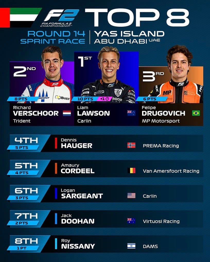 Deja victorieux cette saison au Castellet, à Spa en Autriche et aujourd’hui à Yas Marina.La course s’est jouée et décidée au dixième tour lorsque Lawson a dépassé le leader de l’équipe Trident, le Néerlandais Richard Verschoor.