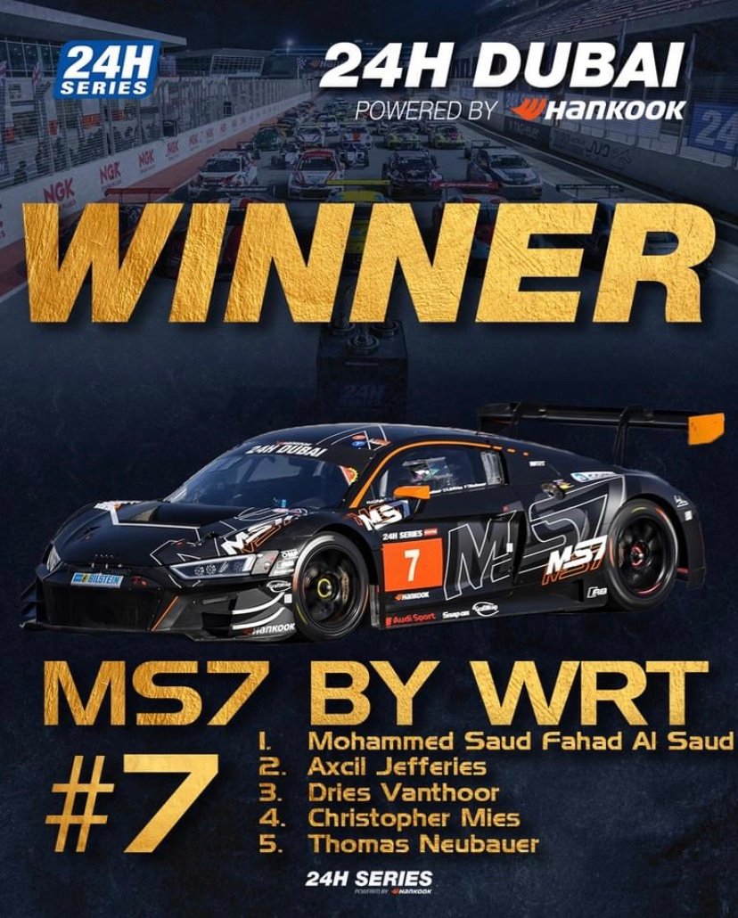 Après avoir débuté la course en pole position, l’équipe avec Saud Fahad Al Saud, Axcil Jefferies, Dries Vanthoor, Chris Mies et le jeune Français Thomas Neubauer, a fait un effort incroyable pour rester en P1 avec leur Audi R8 LMS GT3 !Après une longue bataille avec l’écurie Allemande Haupt Racing Team, avec sa voiture sœur (#31) MS7 par WRT remporte la première course 24H SÉRIE de 2022 !Et non seulement ils ont gagné la GT Overall, mais aussi la GT3 Class !