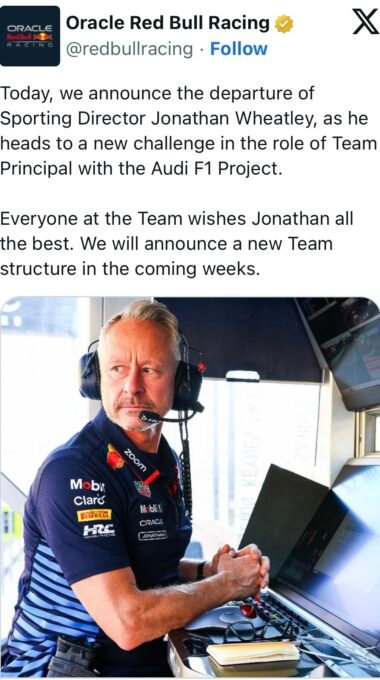 Jonathan Wheatley quittera son rôle de directeur sportif de l’equipe Red Bull en GP F1 pour devenir directeur de la future écurie Audi F1, l’actuel Team Suisse Sauber Wheatley est devenu une personnalité importante pendant près de deux décennies au sein de l’organisation Autrichienne et a joué un rôle clé dans la victoire de 13 championnats du monde.
