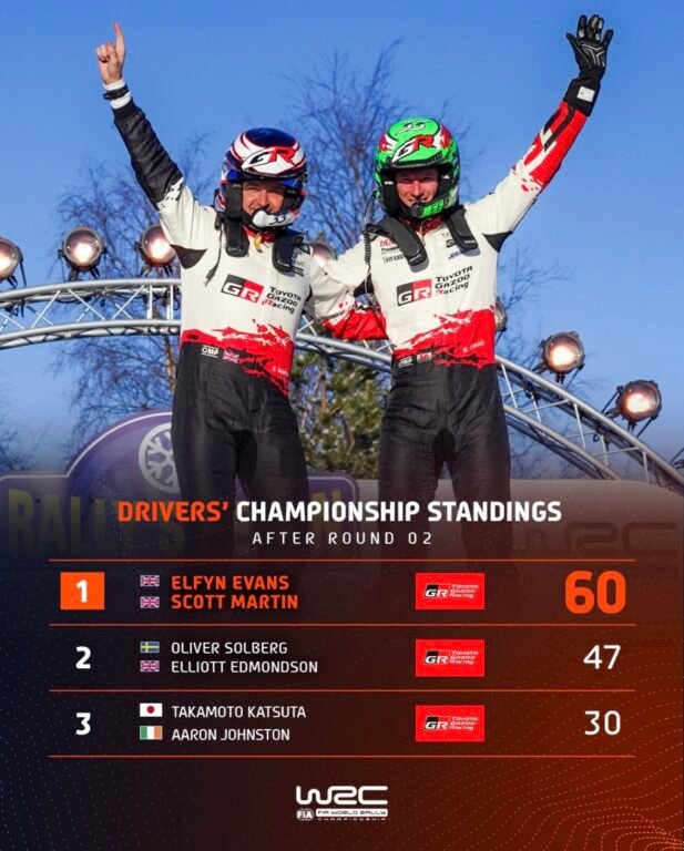 Ce résultat permet à Evans de devancer Oliver Solberg et de disposer de 13 points d’avance en tête du classement provisoire du Championnat des pilotes 2026, après deux manches, tandis que Toyota porte son avance au Championnat des constructeurs à 52 points sur Hyundai.