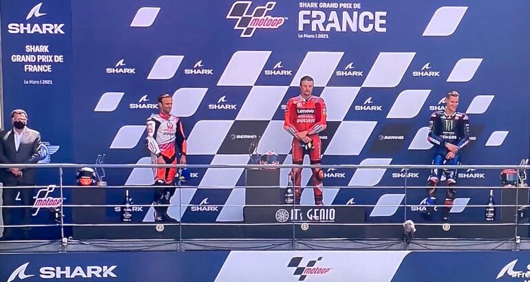 JACK MILLER, LE VAINQUEURDU GRAND PRIX DE FRANCE 2021, EN MOTO GP[/caption] Certes, la victoire revient à l’Australien Jack Miller, l’un des ‘ guerriers ‘ de l’armada Ducati, qui a bien su profiter et bénéficier des conditions météo difficiles, la pluie faisant son apparition quelques tours aprés le départ, donné lui sur une piste sèche, et obligeant du coup, le drapeau blanc étant de sortie et agité, les pilotes, à un changement de moto, utilisant la machine de réserve, chaussé de pneumatiques pluie.COCO RICO ….